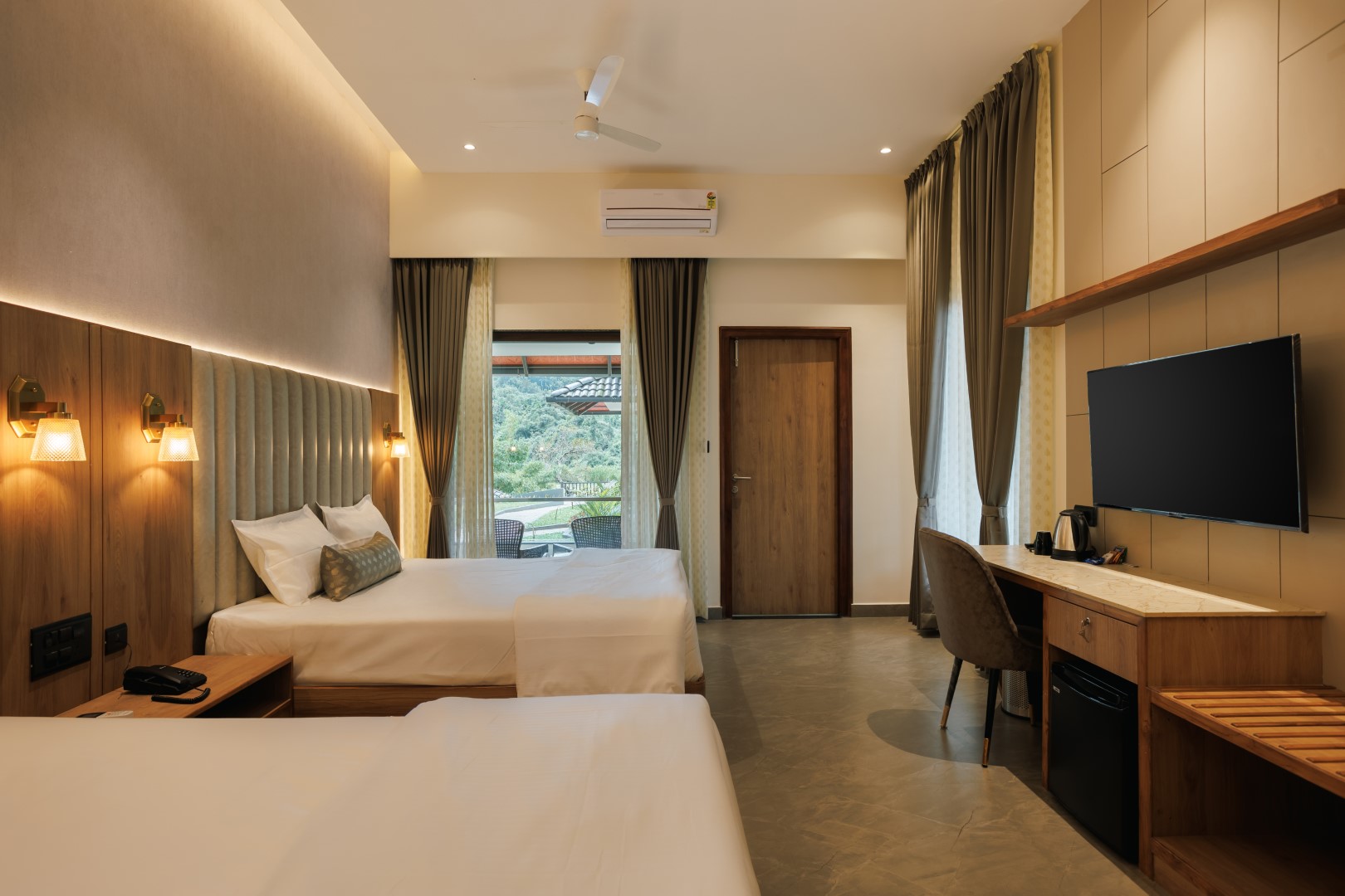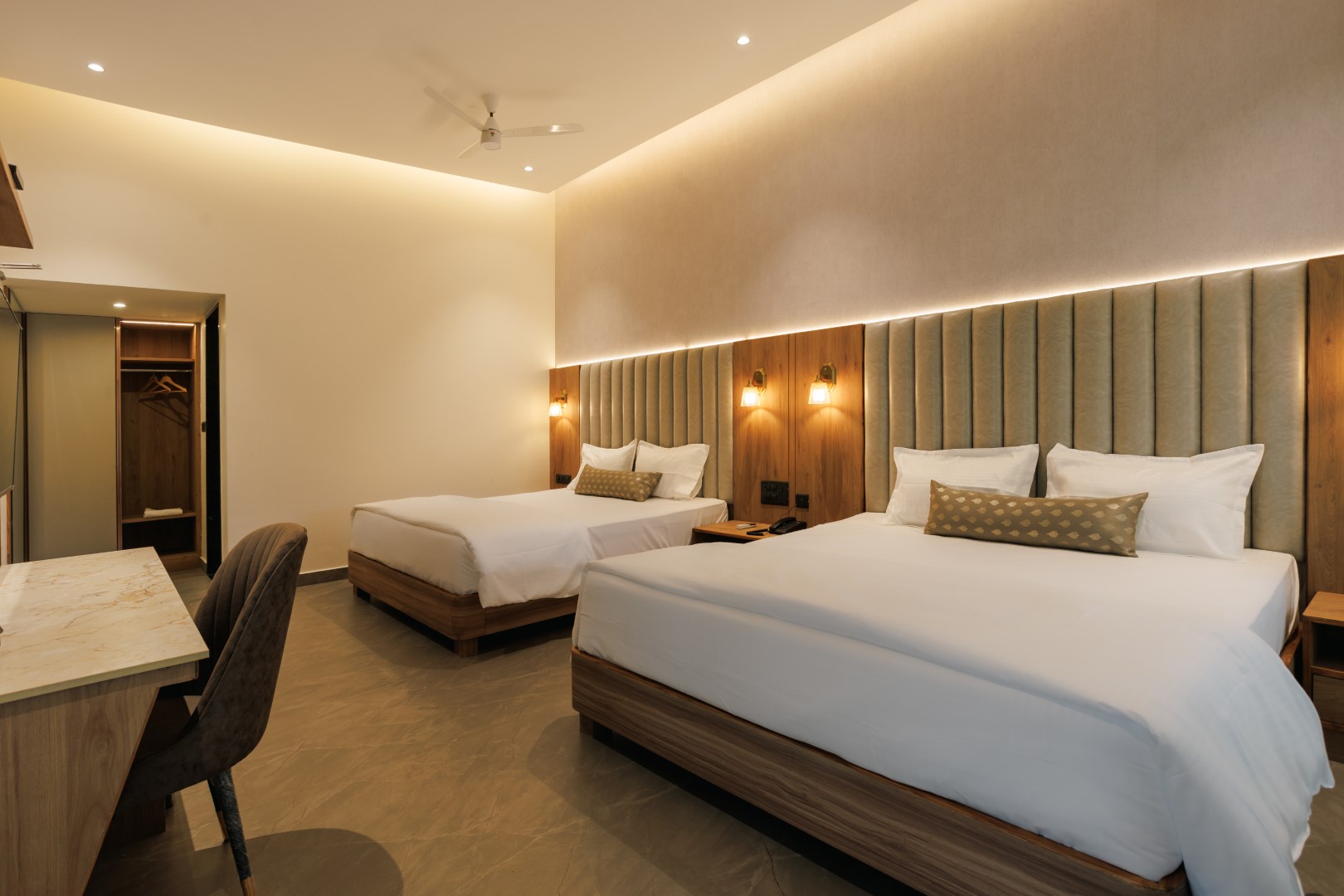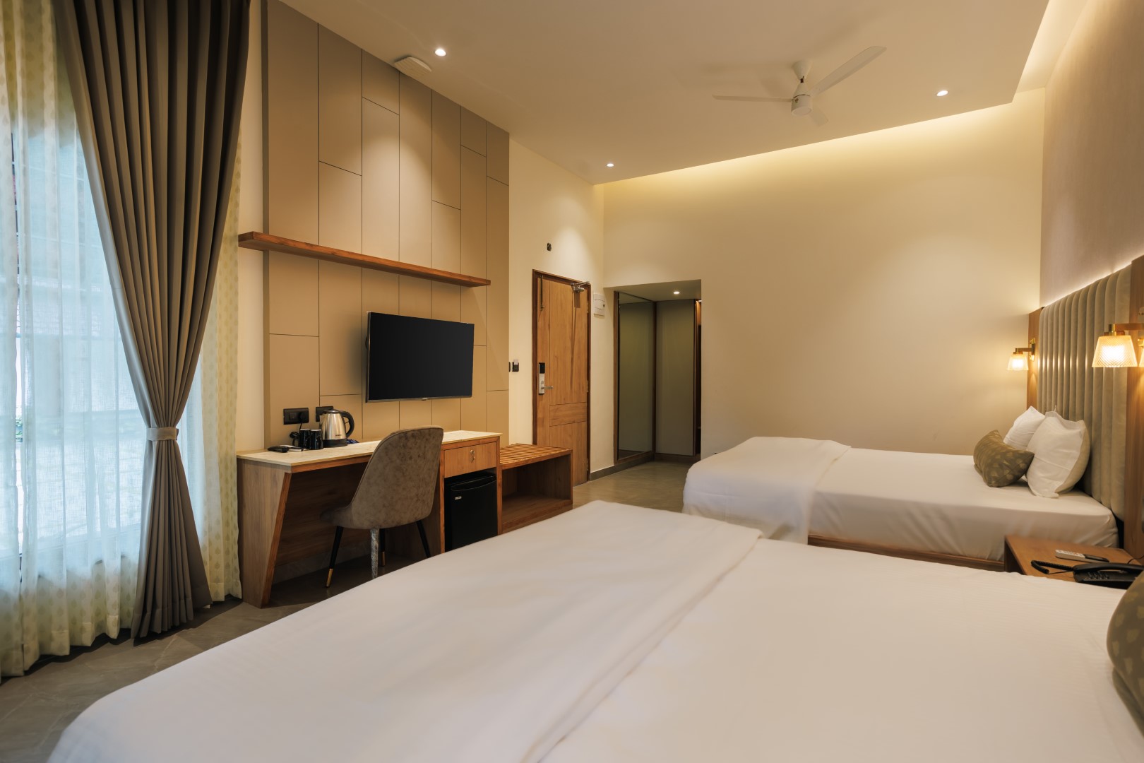 Gather with family or friends in the spacious Superior Quad Room, featuring two queen-sized beds and ample space. Enjoy modern amenities, a cozy atmosphere, and the beauty of Kottigehara, making it the ideal choice for group getaways.